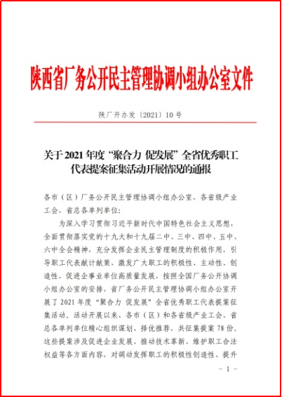 近日,從陜西省總工會(huì)傳來(lái)喜訊,寶光集團(tuán)《關(guān)于固封極柱產(chǎn)品制造部擴(kuò)充產(chǎn)能的提案》榮獲陜西省2021年度“聚合力 促發(fā)展”全省優(yōu)秀職工代表提案。