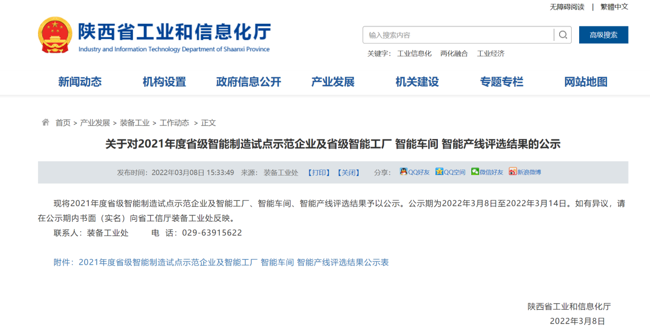 3月14日,陜西省工信廳裝備工業(yè)處發(fā)布2021年度省級智能制造試點示范企業(yè)及省級智能工廠名單,寶光股份獲評“2021年度省級智能工廠”。